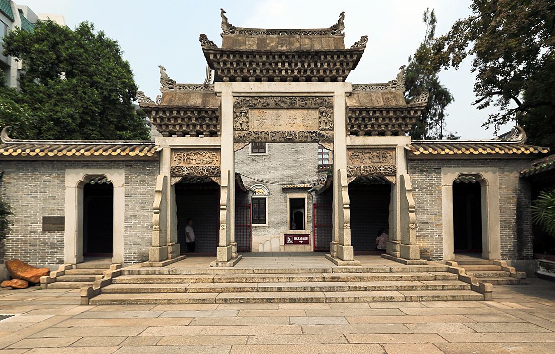Fue construido en 1894 de la dinastía Qing por la empresa conjunta de todos los chens de la provincia. Originalmente se usó como residencia para los hijos de los chens cuando llegaron a Guangzhou para participar en los exámenes imperiales. Pero después de que se abolió el sistema, se convirtió en la academia de la familia. Este templo familiar es de gran tamaño, decorado de forma llamativa y muy bien conservado. Toda el área de la estructura ocupa un área de 8,000 metros cuadrados que contiene esculturas, pantallas, ventanas y barandas complicadas y elegantes, etc. Los edificios en sí son obras de arte que fueron visitadas y altamente elogiadas por muchos arquitectos de todo el mundo.
