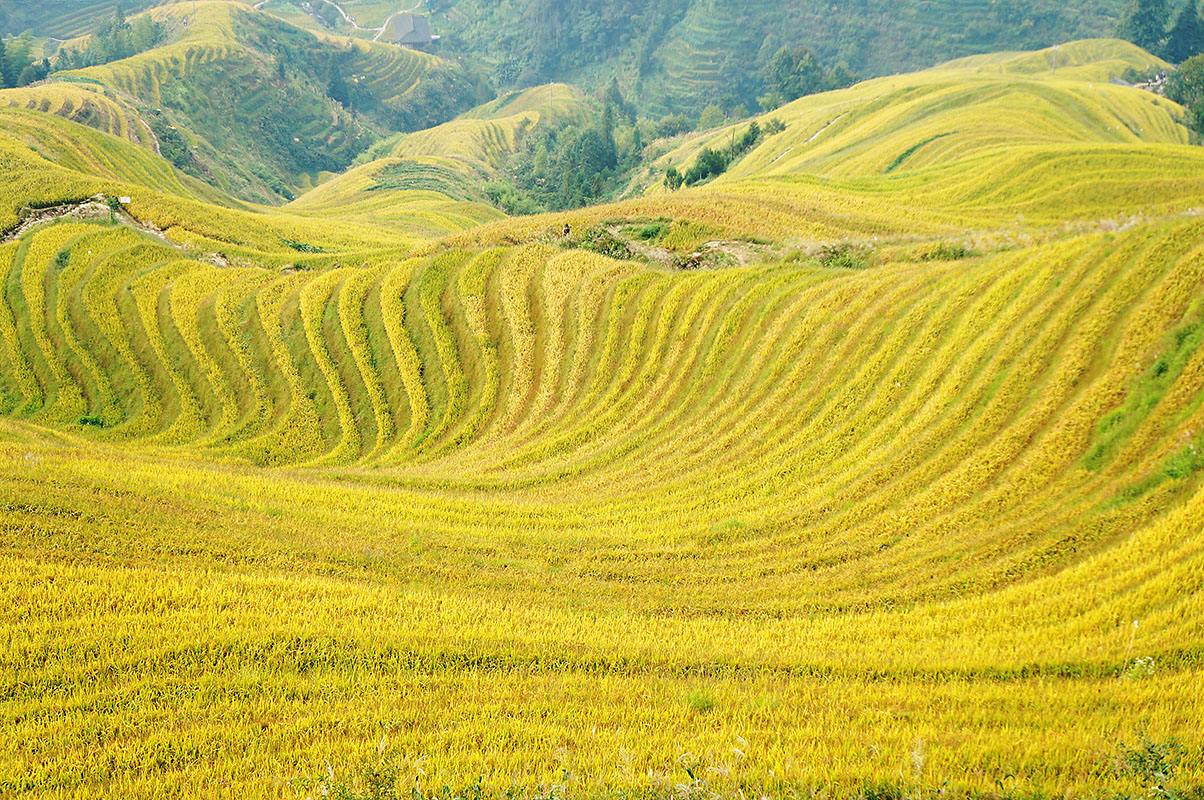 Terrazas: Una gran y vasta terraza de campos de arroz se extiende capa por capa, desde las estribaciones del Longji (la cresta del dragón) hasta la cima de la montaña.
